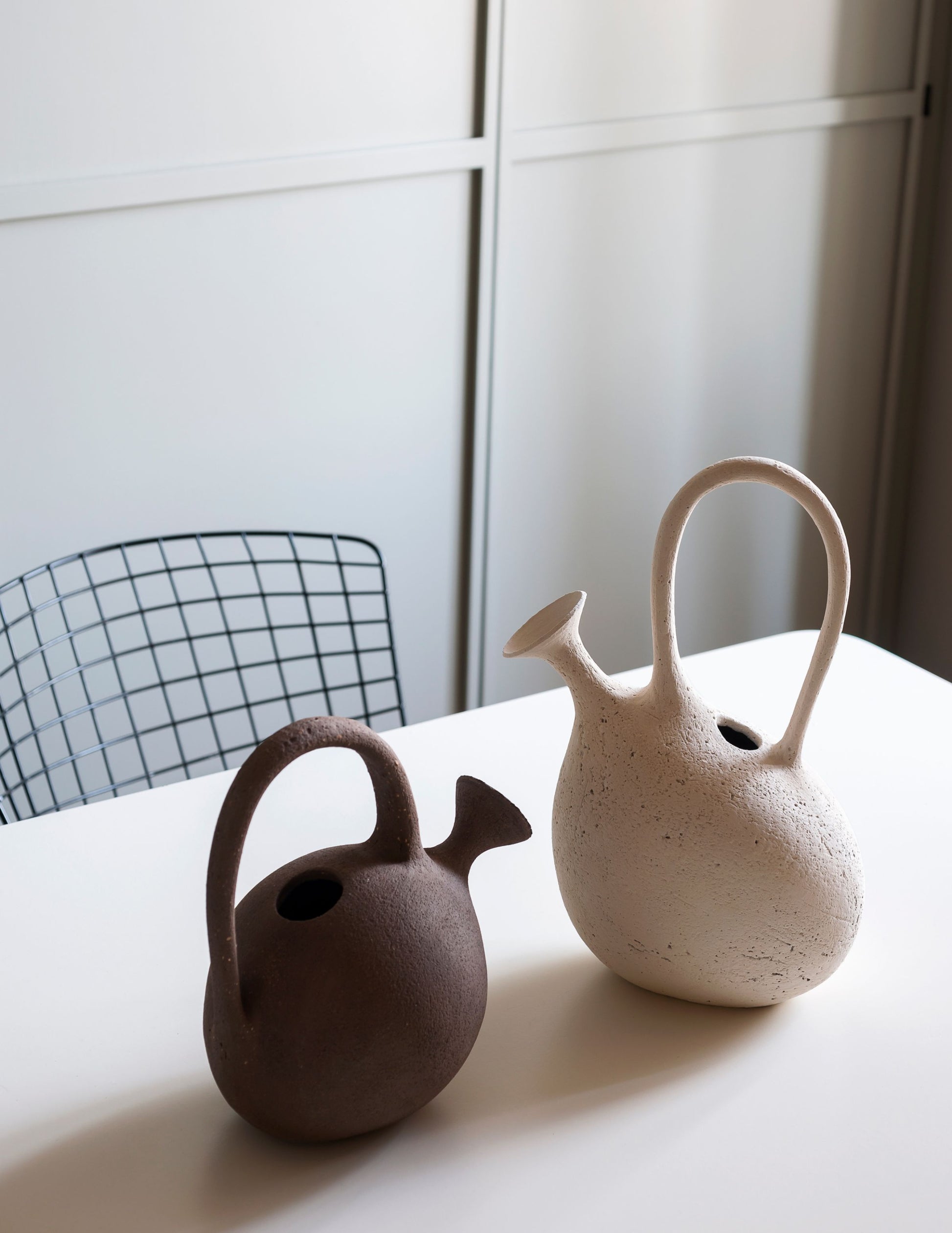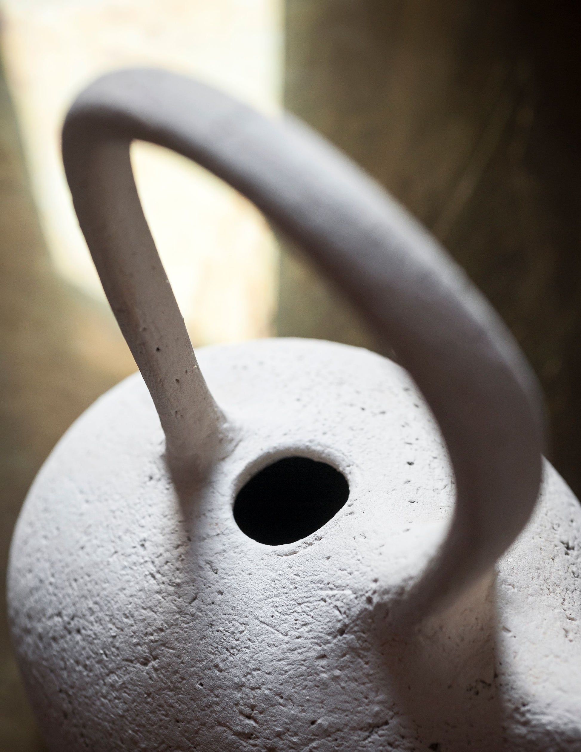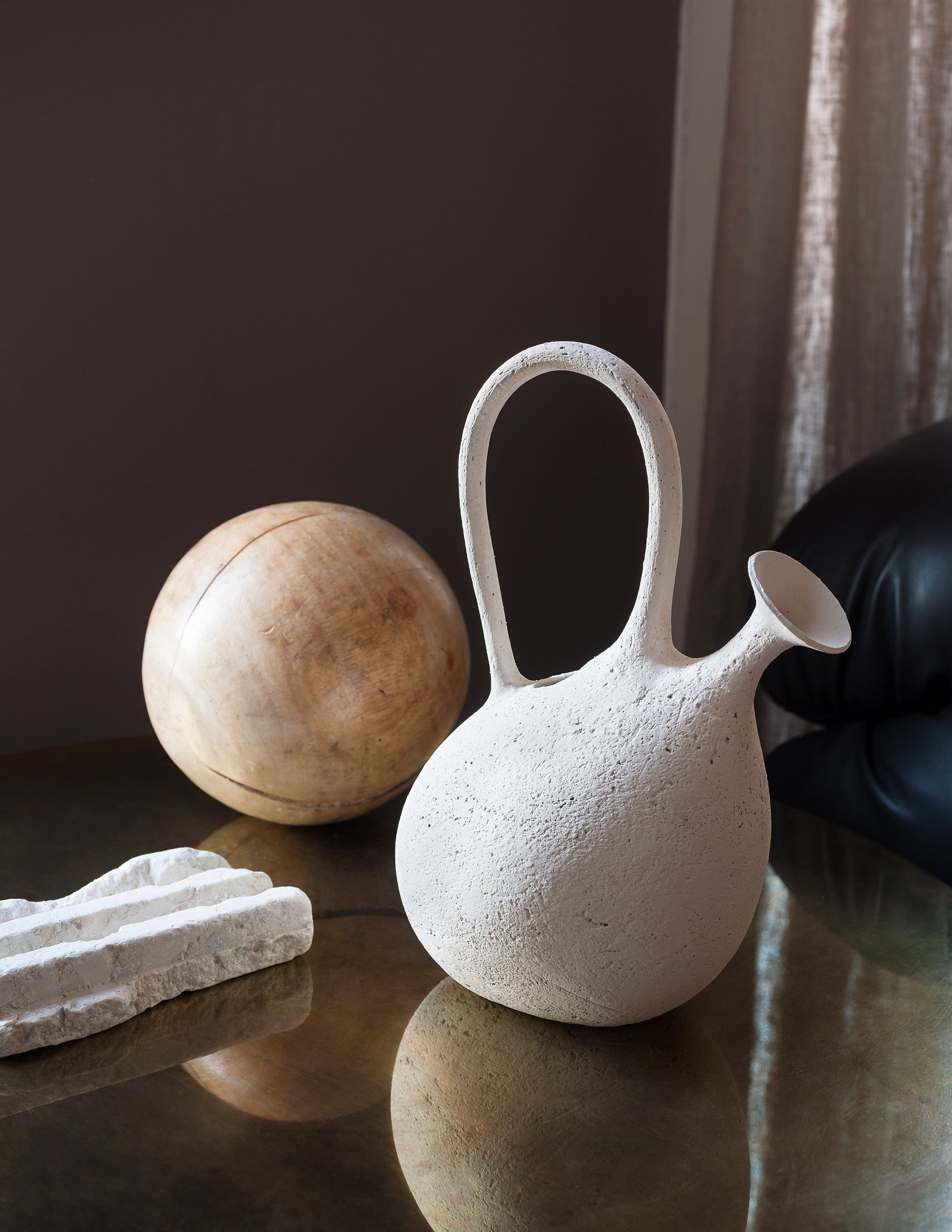 L'amphore Aqua Regis évoque les formes de célèbres vases antiques et les réinterprète de manière contemporaine, en valorisant la matérialité de l'argile dans deux tons qui rappellent les couleurs de la terre. L'amphore est un témoignage extraordinaire des cultures anciennes. Cet objet autrefois utilisé pour transporter les aliments nous permet aujourd'hui d'approfondir de nombreuses connaissances historiques et archéologiques. Dans cette version contemporaine, Studiopepe la baptise Aqua Regis – du nom de la solution alchimique capable de dissoudre l'or – et la transforme en un vase aux formes douces, doté d'une seule anse latérale et d'une large surface d'appui à la base, réalisé au tour en engobe semi-réfractaire.