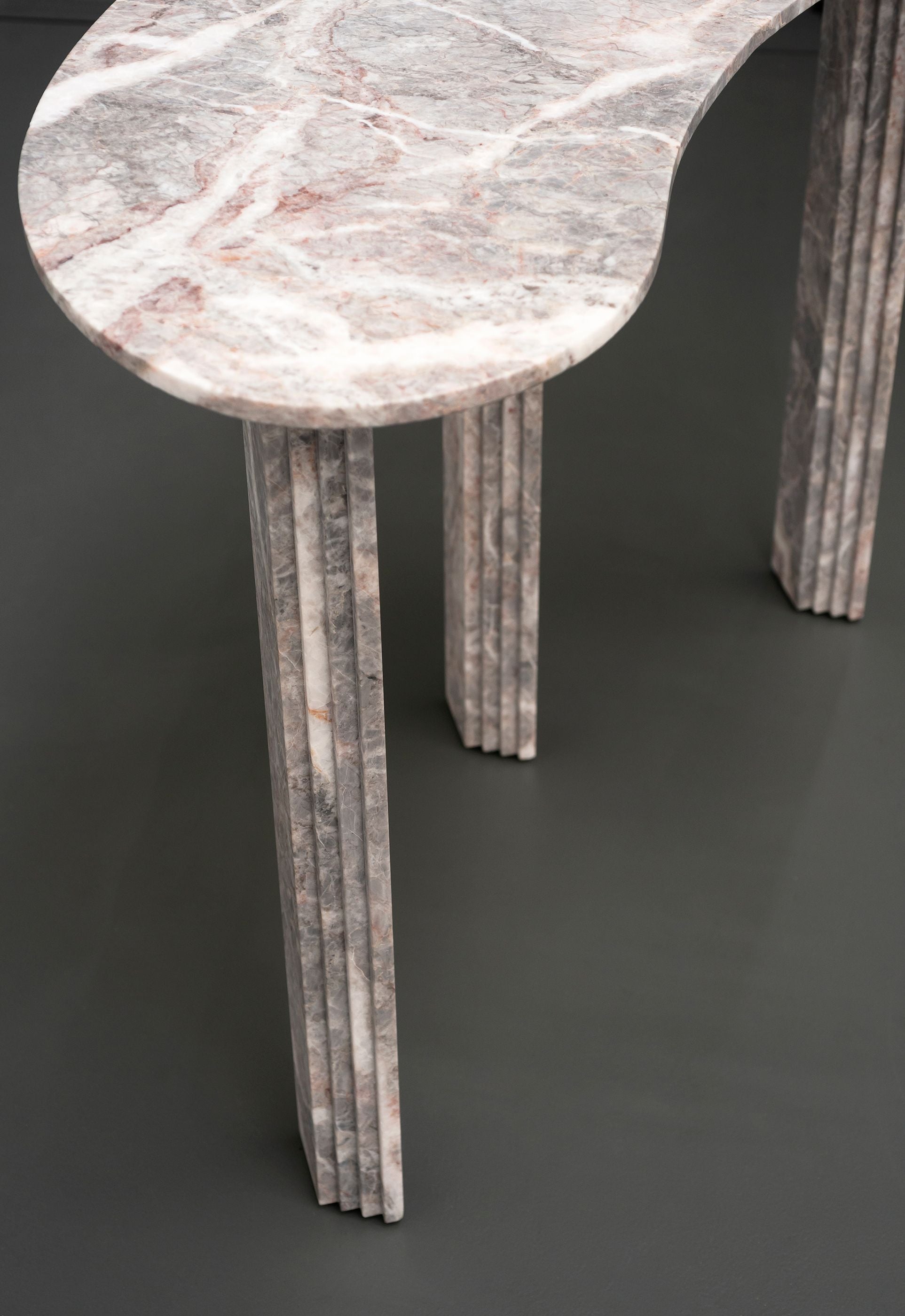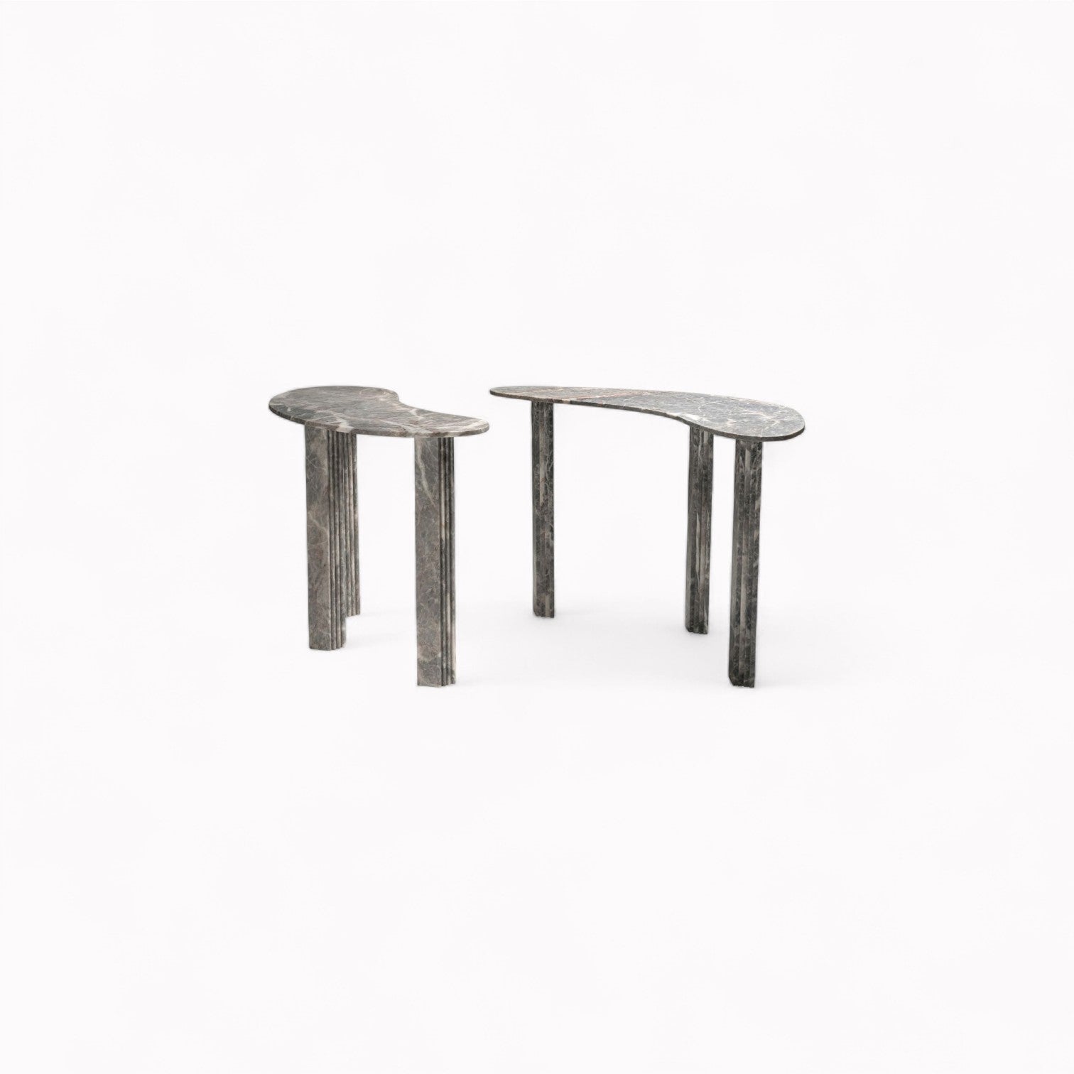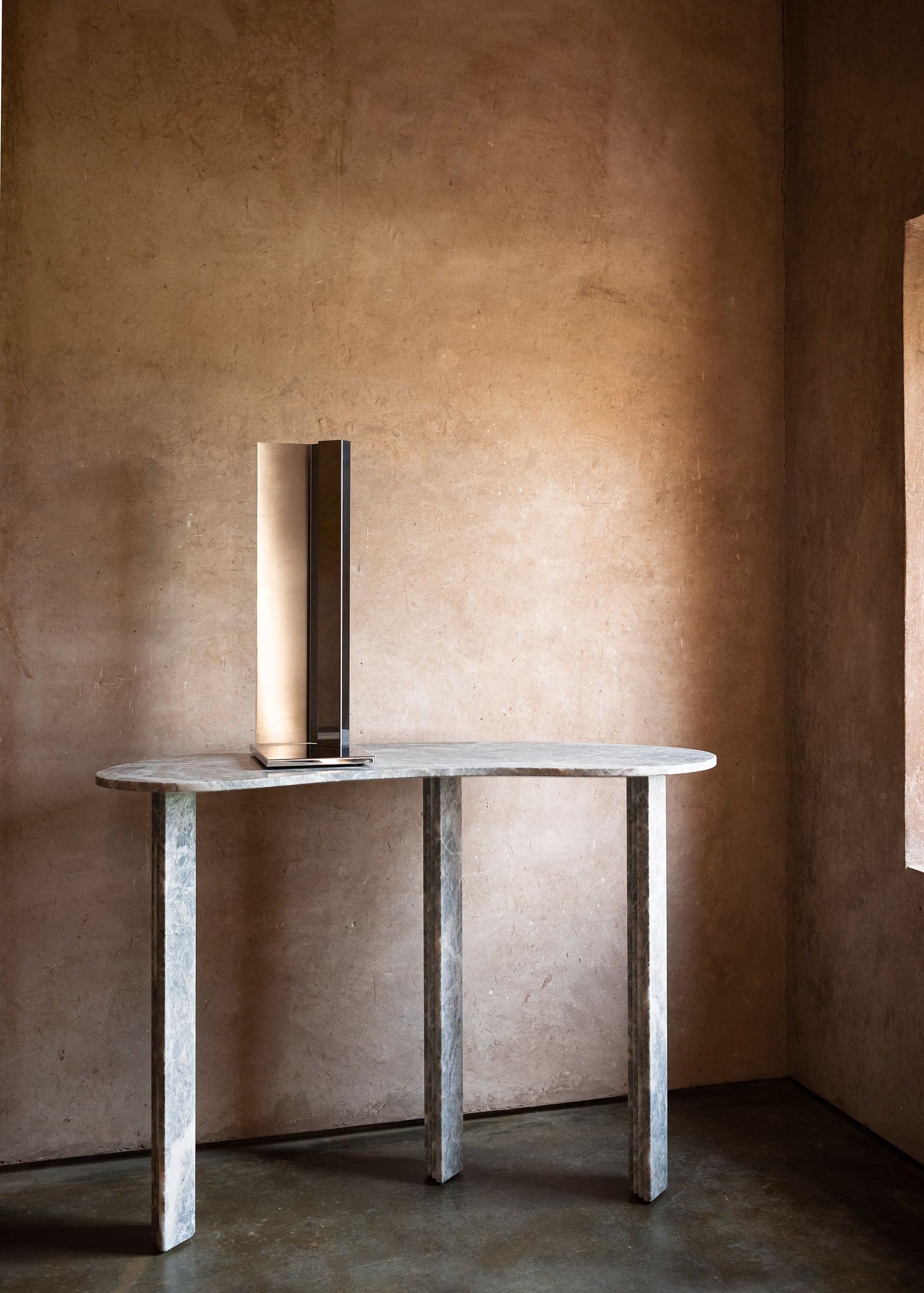 Dans les consoles Colombo et 1953, les dessins définis dans les lignes tracées par Jean Arp et Gianni Colombo prennent une nouvelle expression, capturée dans une plaque de marbre de forme irrégulière. Dans ces consoles, Lorenzo Bini capture des œuvres modernes et contemporaines sur une surface irrégulière qui devient le lieu où art et design se rencontrent : quelques détails simples suffisent à une seule plaque de marbre pour lui donner des formes fluides et des géométries dynamiques. Trois pieds, créés par la juxtaposition de quatre bandes légèrement décalées du même marbre, soutiennent le plateau, un hommage à la sculpture et à l'art dans un subtil équilibre entre rigueur et légèreté.