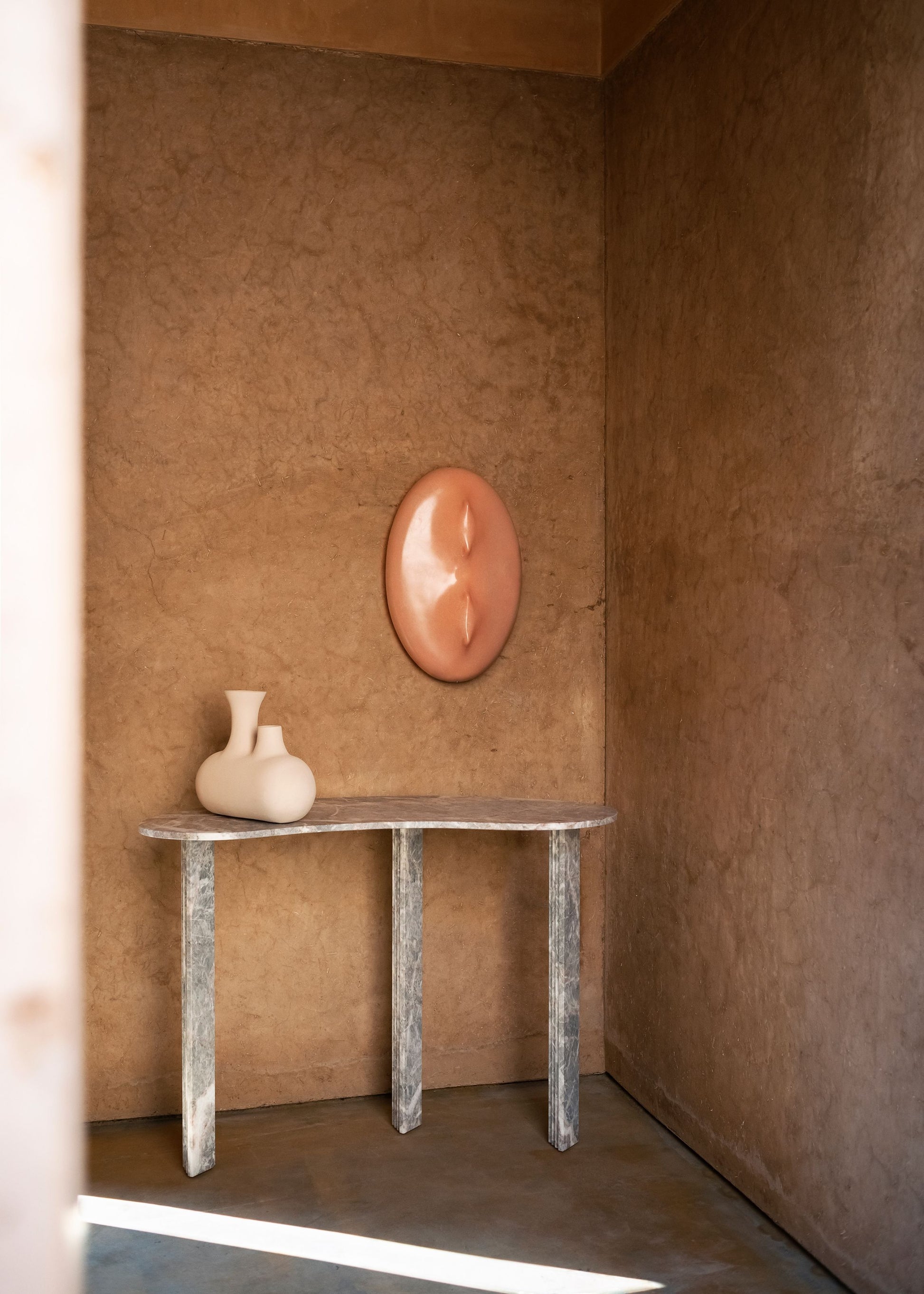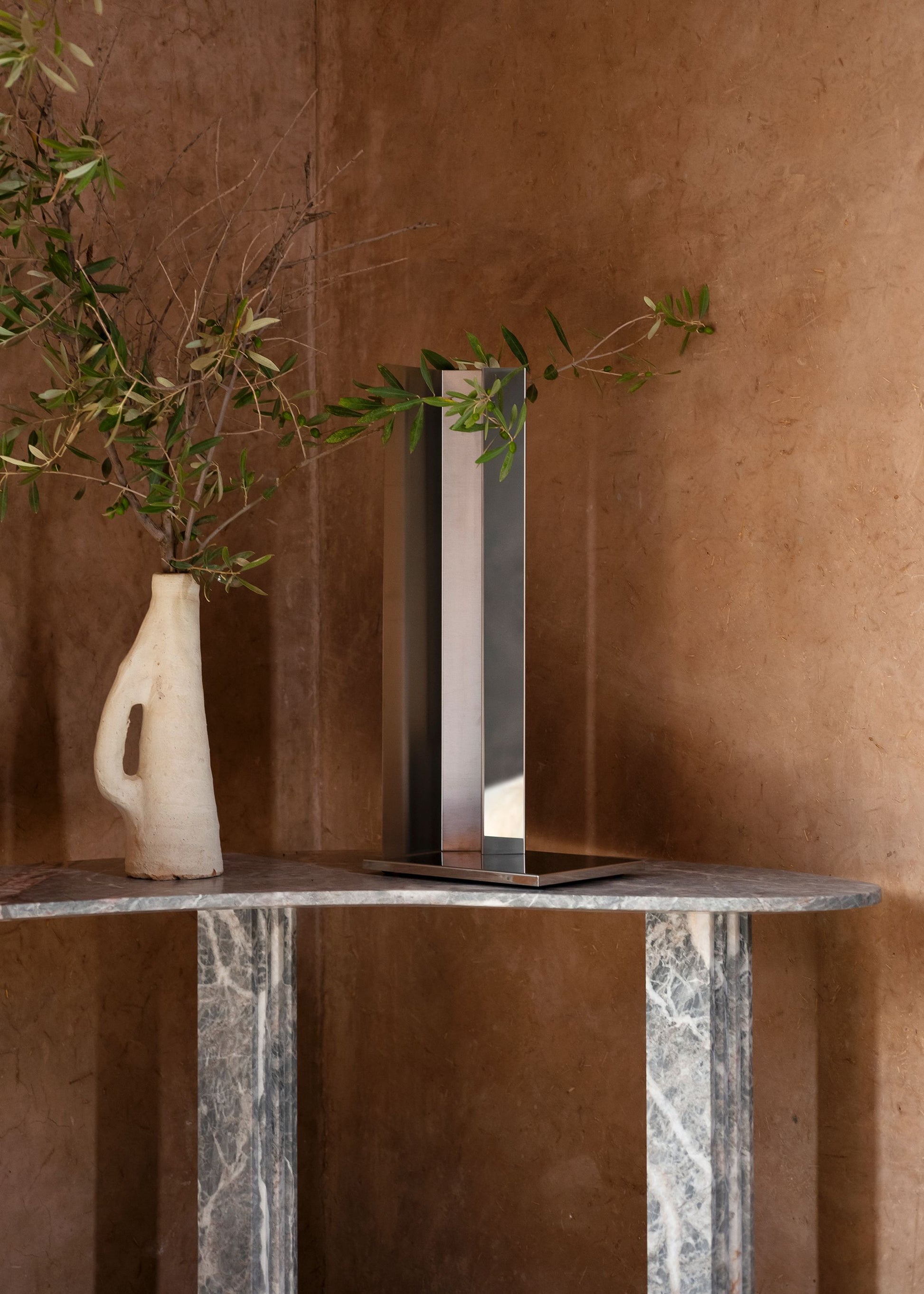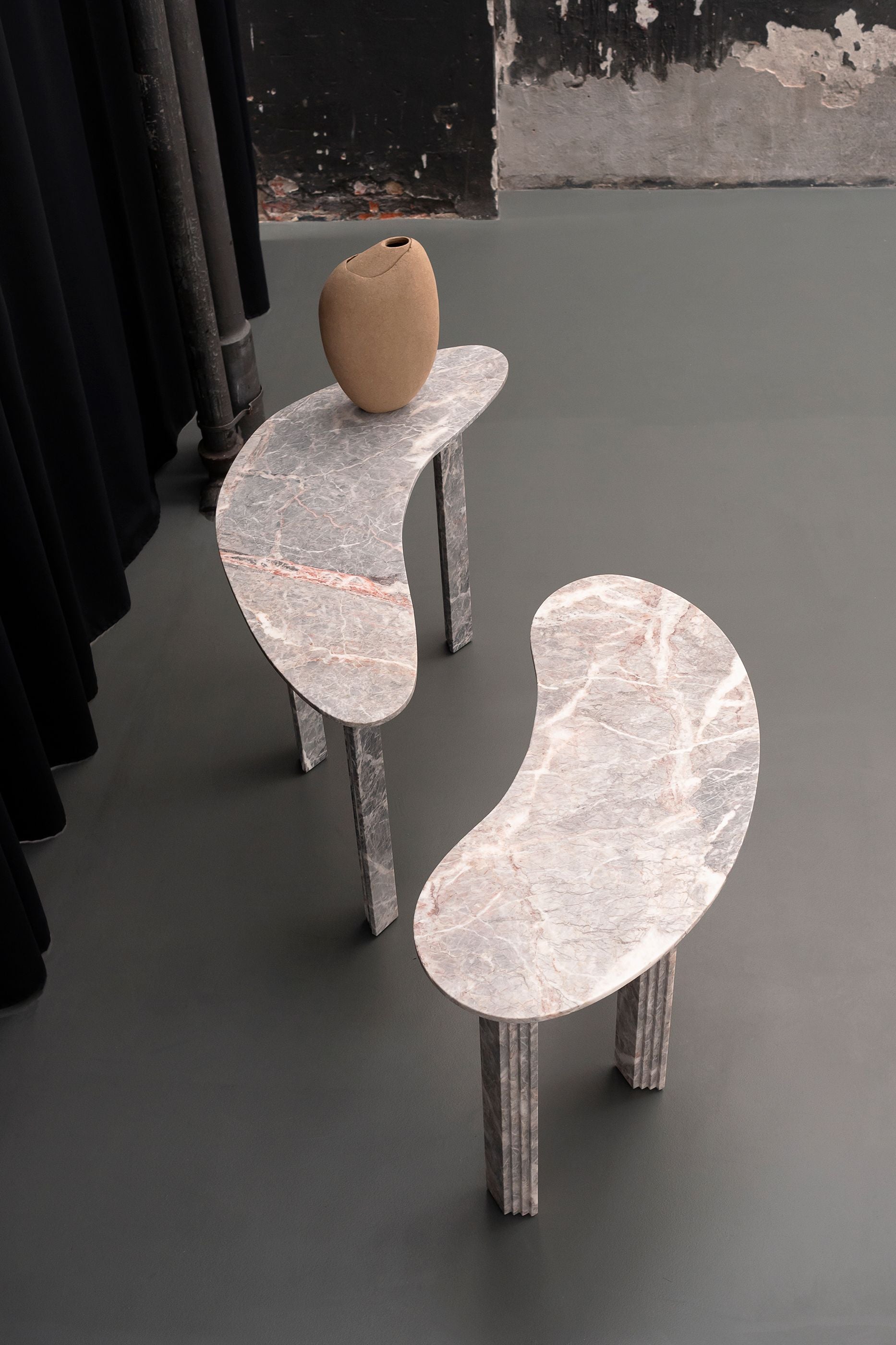 Dans les consoles Colombo et 1953, les dessins définis dans les lignes tracées par Jean Arp et Gianni Colombo prennent une nouvelle expression, capturée dans une plaque de marbre de forme irrégulière. Dans ces consoles, Lorenzo Bini capture des œuvres modernes et contemporaines sur une surface irrégulière qui devient le lieu où art et design se rencontrent : quelques détails simples suffisent à une seule plaque de marbre pour lui donner des formes fluides et des géométries dynamiques. Trois pieds, créés par la juxtaposition de quatre bandes légèrement décalées du même marbre, soutiennent le plateau, un hommage à la sculpture et à l'art dans un subtil équilibre entre rigueur et légèreté.