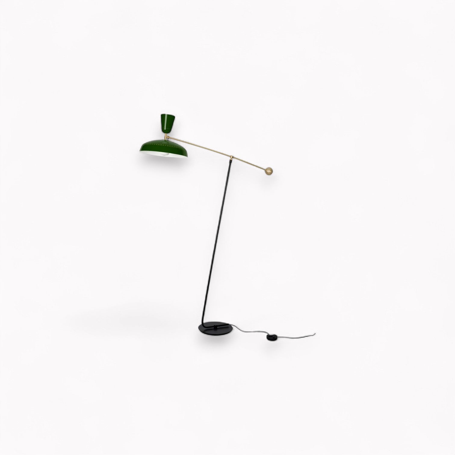 Piétement en acier noir, structure en laiton et abat-jour en métal laqué.
