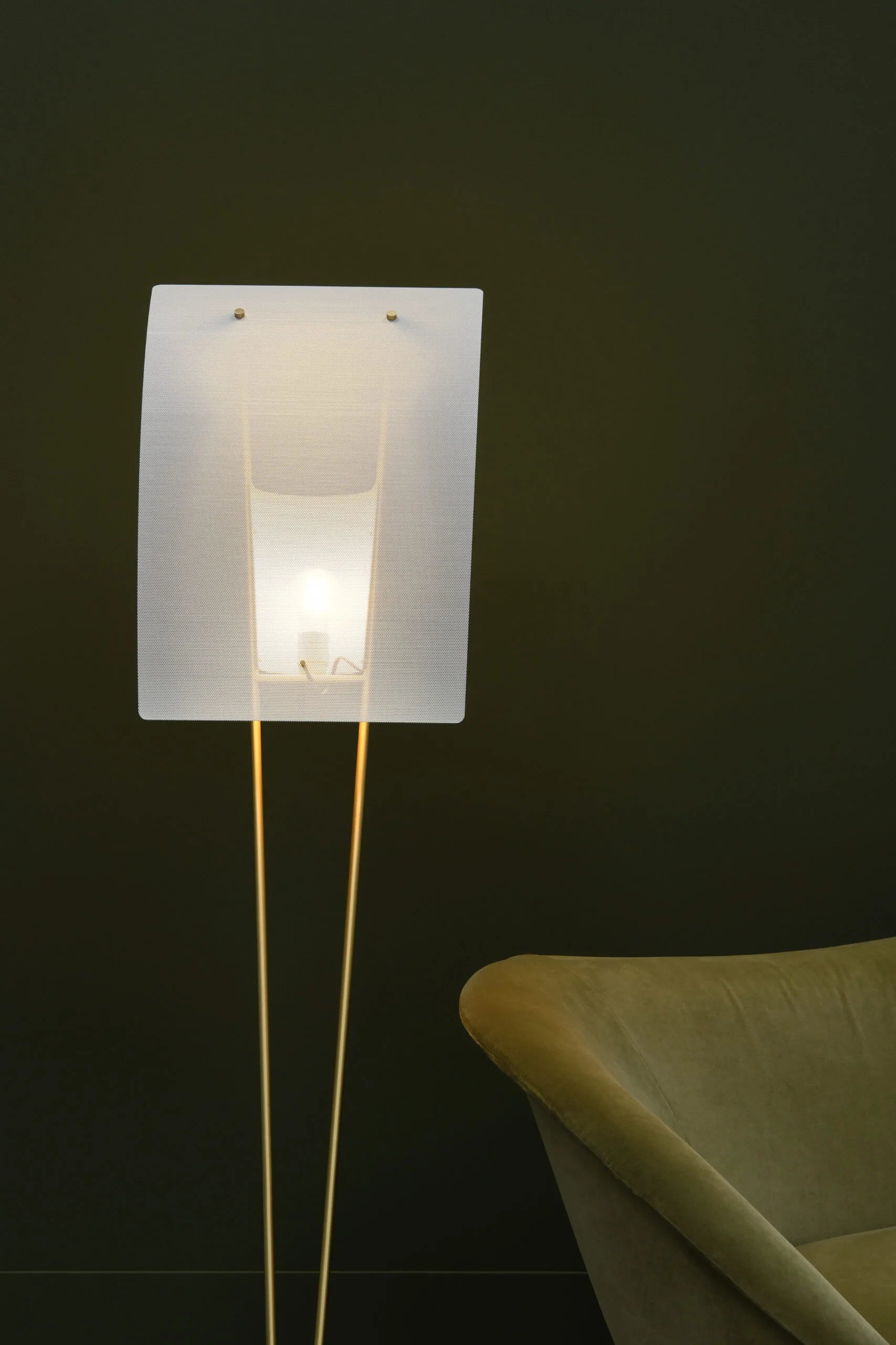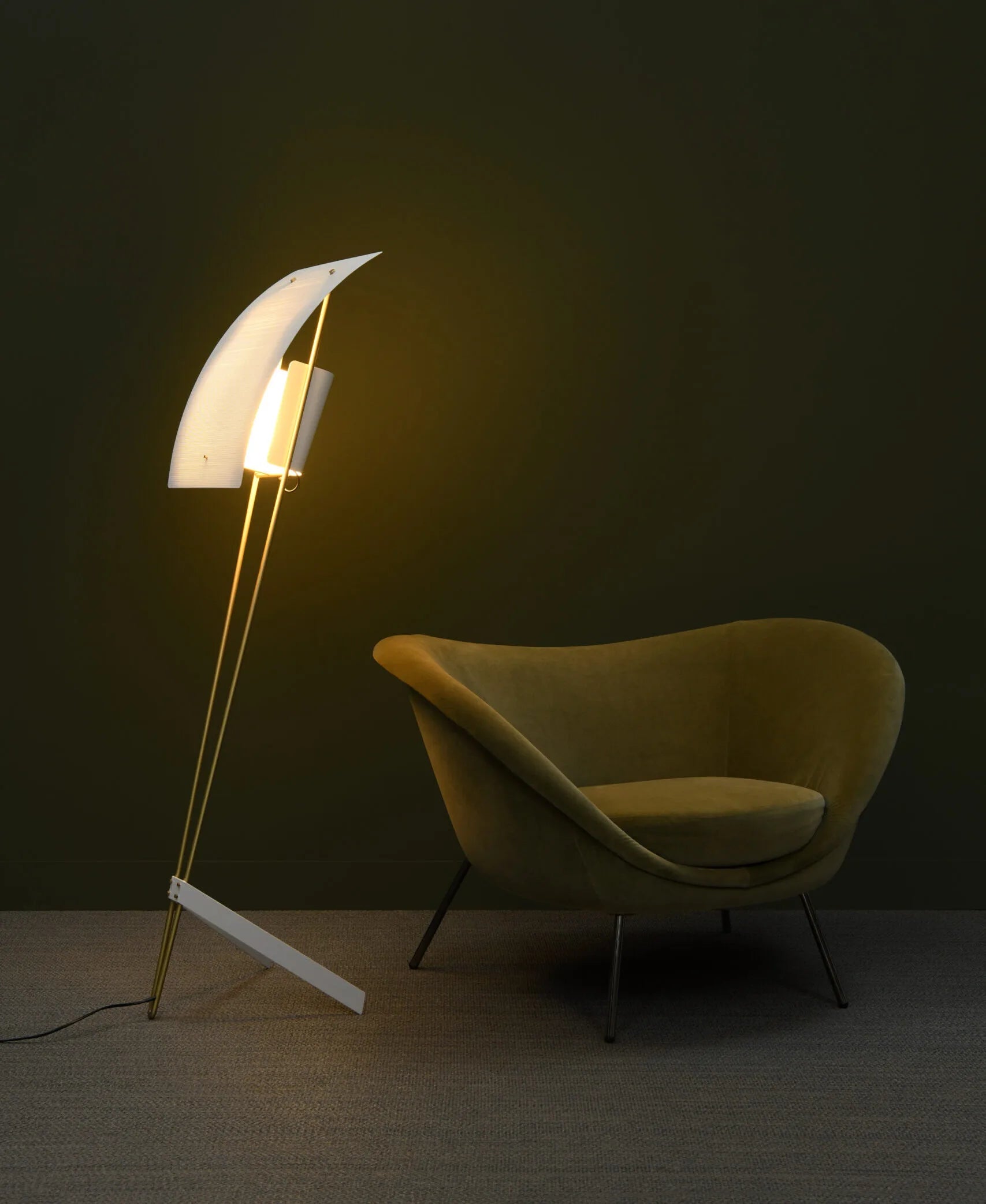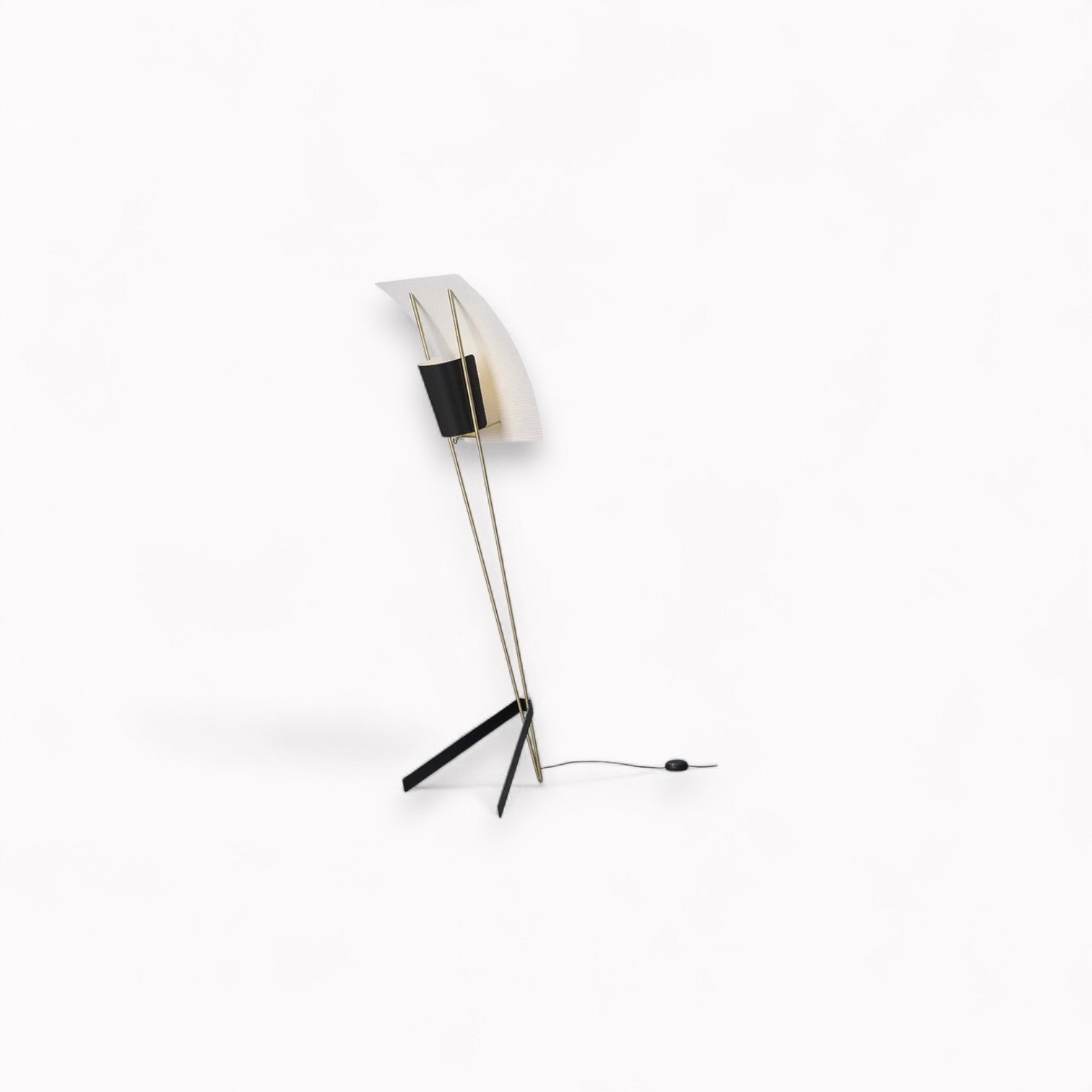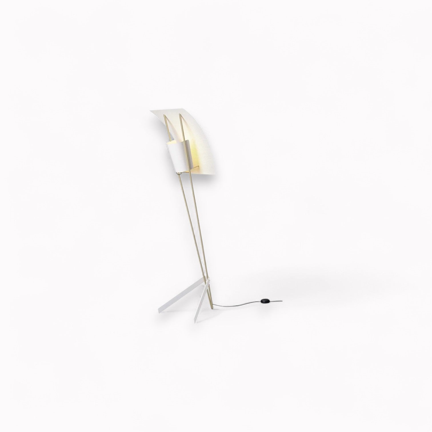 Le « cerf-volant » : tel est le nom que Pierre Guariche lui-même donnait à ce lampadaire saisissant. Sa voile en tôle perforée laquée blanche, à l’image d’une voile de bateau, invite le regard à l’évasion. Aux côtés d’un mat en laiton verni brossé, pied et réflecteur se déclinent en métal noble noir ou blanc pour un univers monochrome ou contrasté(e). Designer et architecte d’intérieur, Pierre Guariche est un des créateurs de luminaires les plus féconds des années 1950.Pierre Guariche a conçu une gamme complète de luminaires ou, plus exactement, des «familles» — lampe de bureau, lampadaire, applique, suspension…, qui comblent tous les besoins identifiés de chaque espace. Ses luminaires offrent un grand confort d’utilisation.
