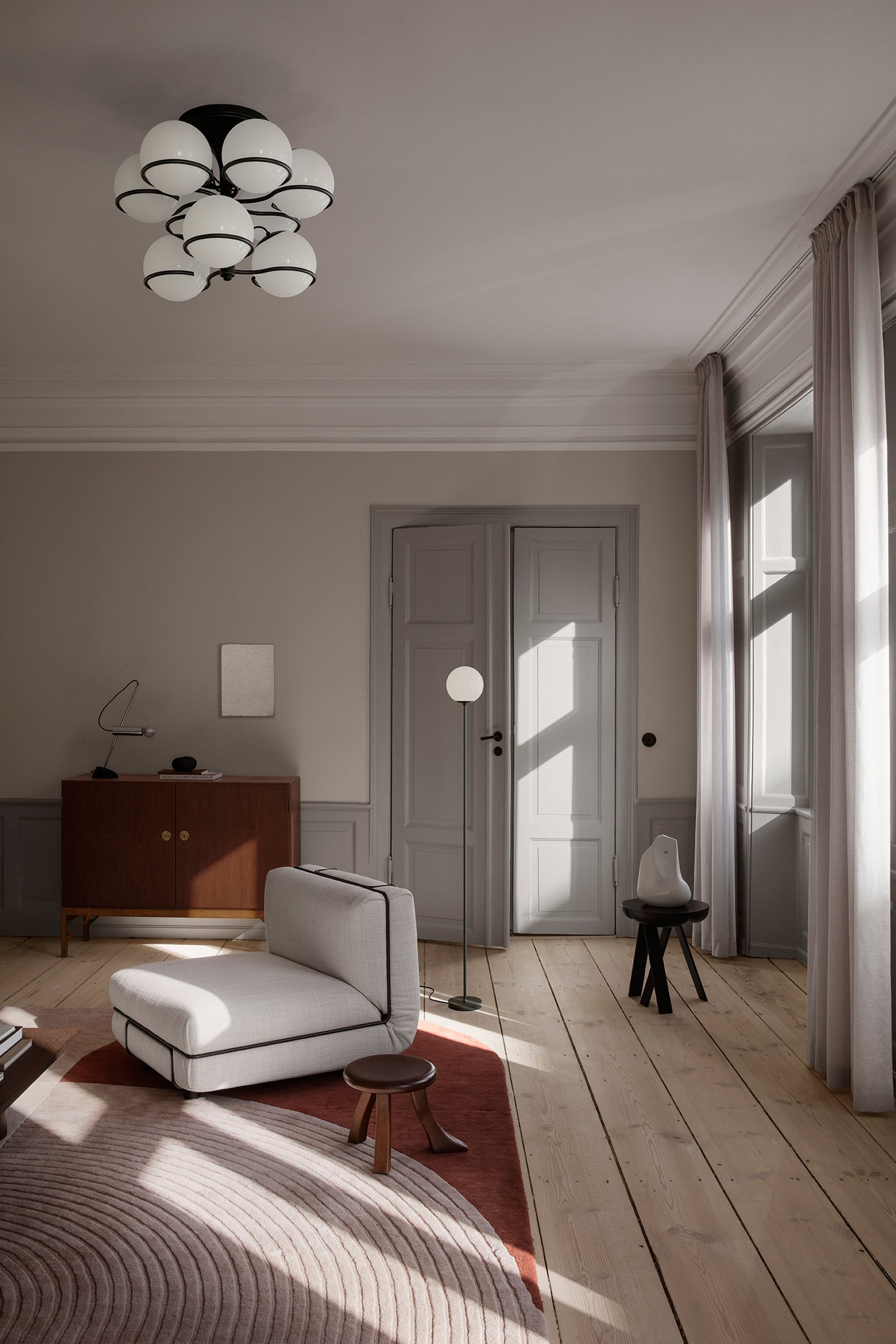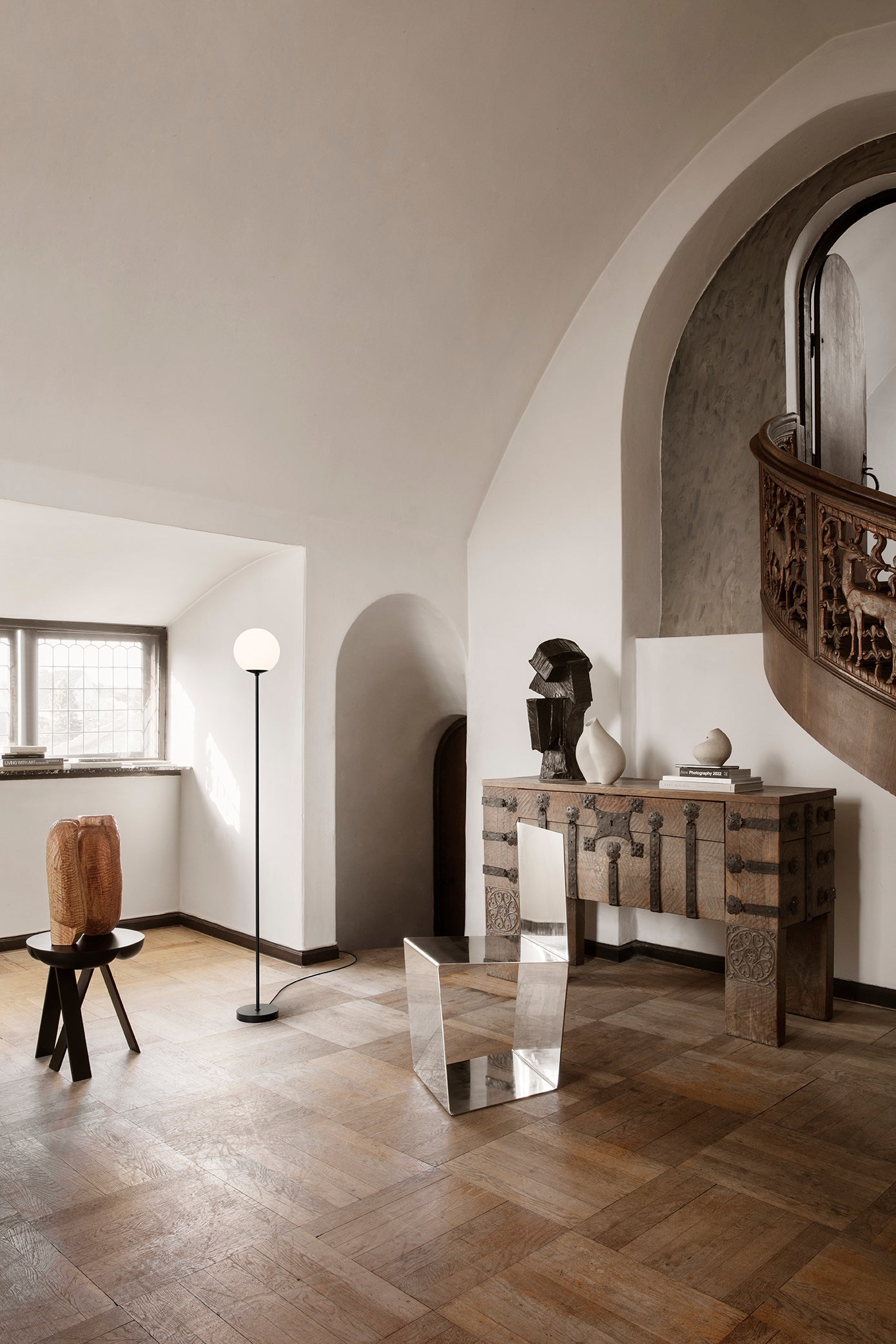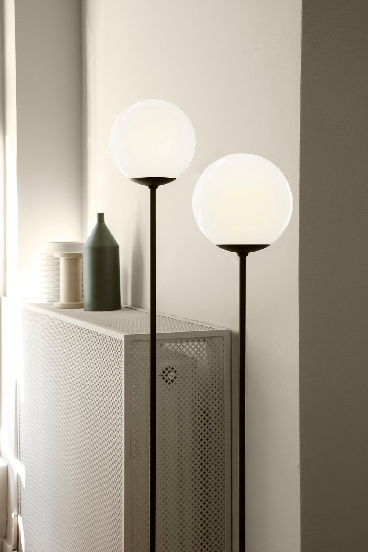 Le modèle 1081 Lampadaire ajoute à la profondeur luxueuse et à la polyvalence de la collection Le Sfere. La forte présence visuelle de ce lampadaire est un exemple d'équilibre. Une sphère lumineuse unique repose délicatement sur la tige et la base en acier noir, formant une structure ornementale. Seule, la lampe se présente comme une sculpture solitaire, tandis qu'en duo, elle forme une composition diffusant une lumière chaude et diffuse. Ce lampadaire est disponible en deux hauteurs: 168 cm et 182 cm.