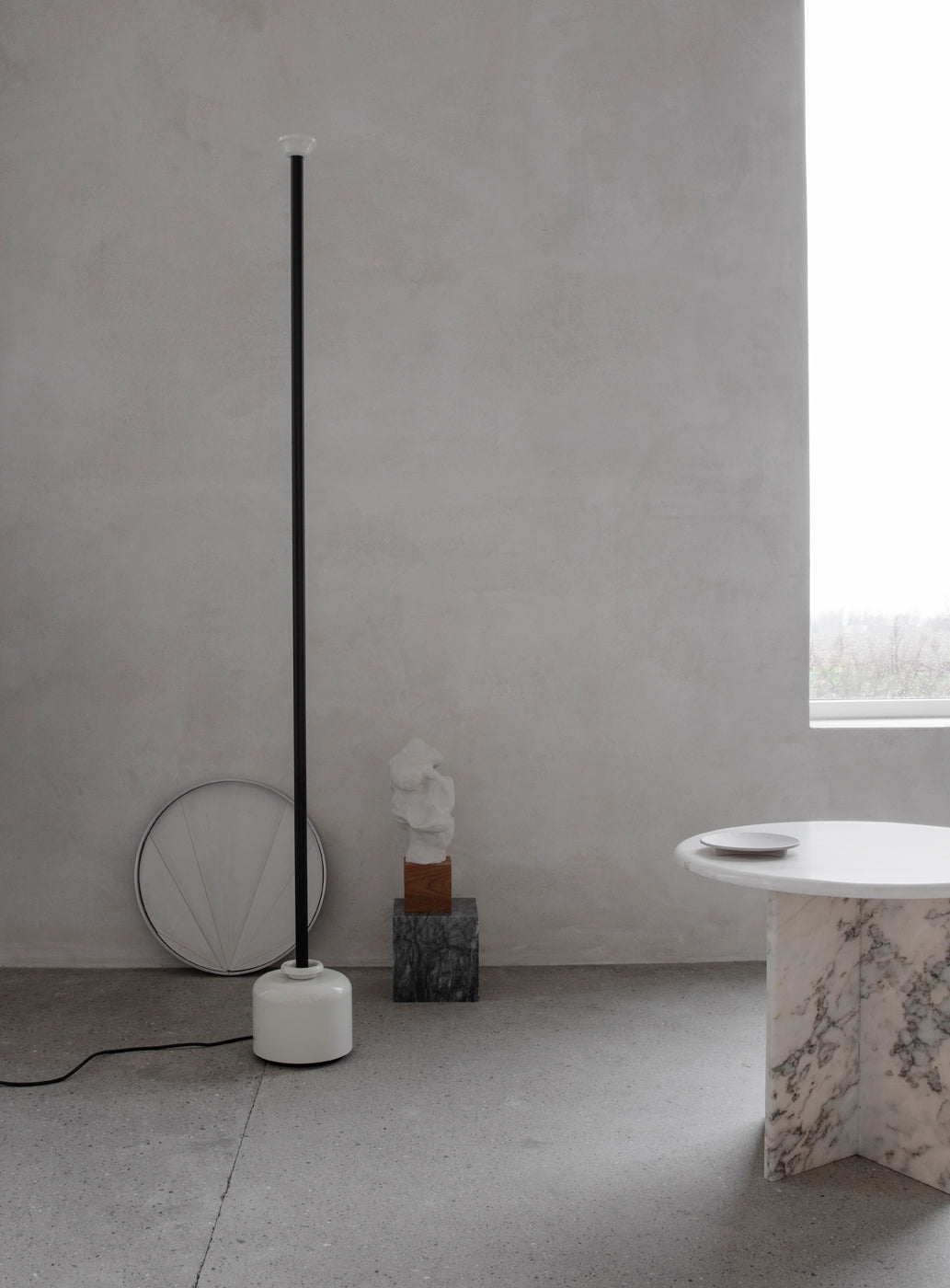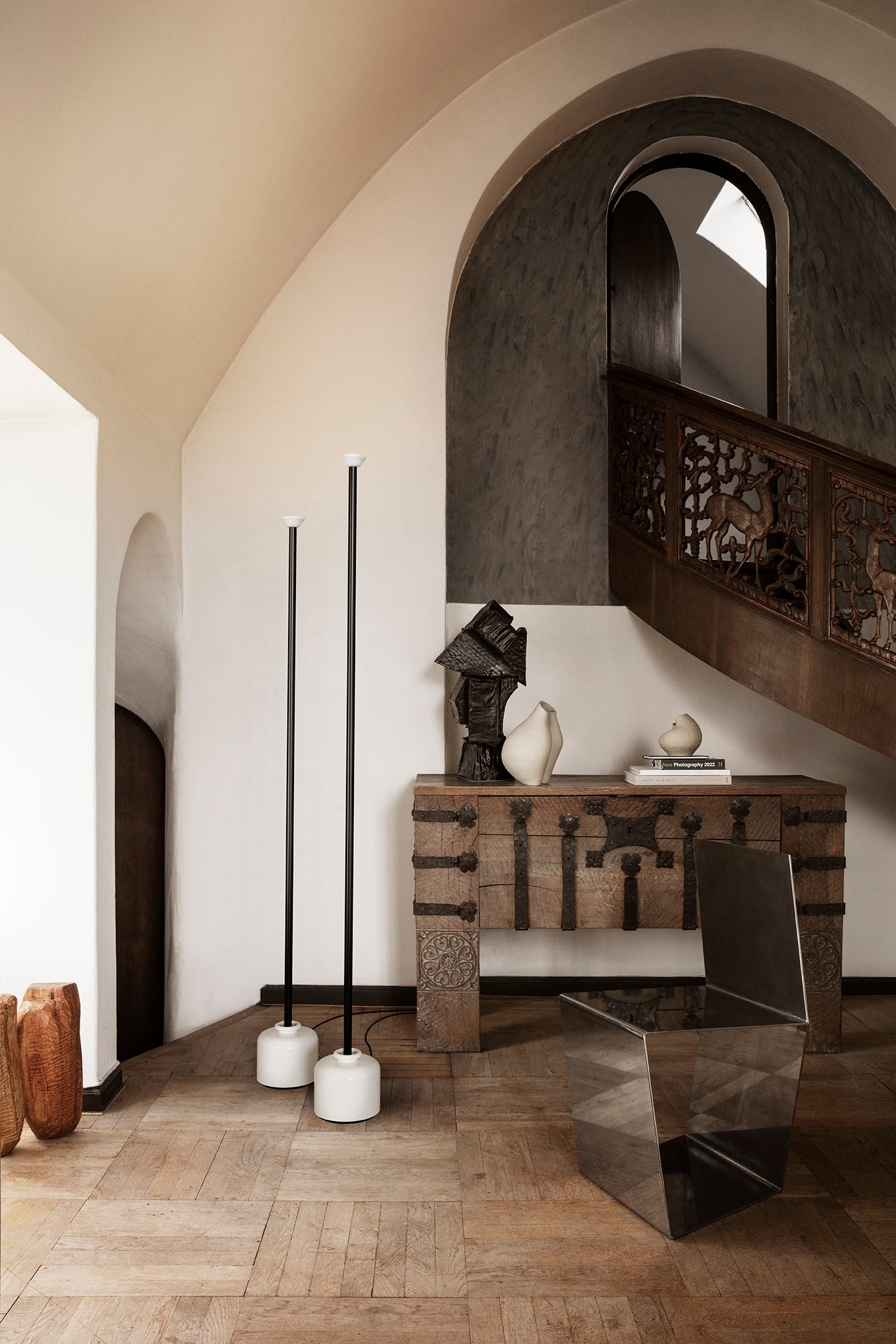 Ce lampadaire conçu en 1968 est élancé, gracieux et intrigant par ses disproportions entre la tête et la base. Le design de la petite coupelle réfléchissante est fortement influencé par la nouvelle ampoule halogène, que Gino Sarfatti a explorée et mise en valeur dans le Modèle 1095, tant sur le plan fonctionnel que dimensionnel. Offrant une lumière indirecte dans un design subtil, le luminaire est constitué d'une tige tubulaire en aluminium, disponible en trois hauteurs différentes et peinte en gris ardoise. La petite coupelle réfléchissante, à la forme fine, est en aluminium peint en blanc, tout comme la base, à la forme douce et au col élégant. Dans cette réédition, la base recouvre les composants électroniques au lieu d'un transformateur. Outre l'éclairage LED, le luminaire est également équipé d'un système de refroidissement liquide breveté par Flos.