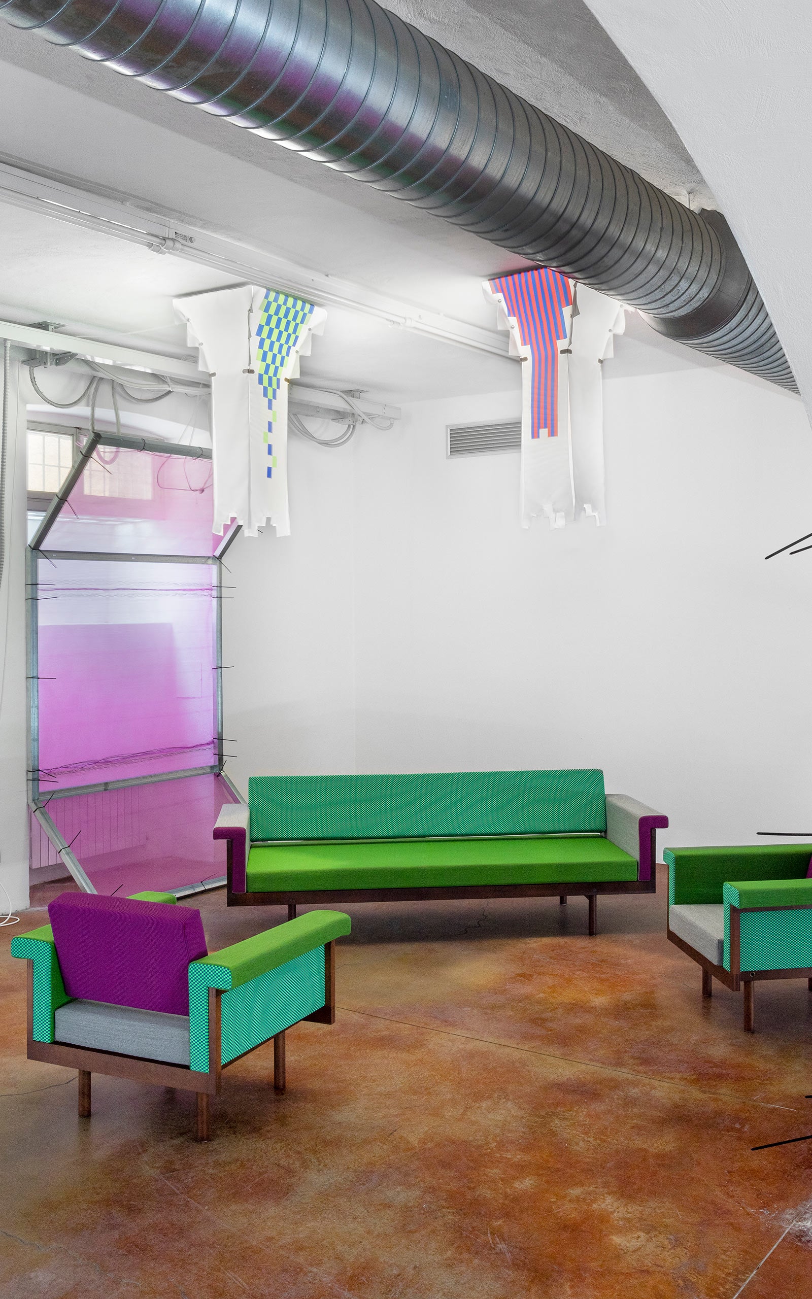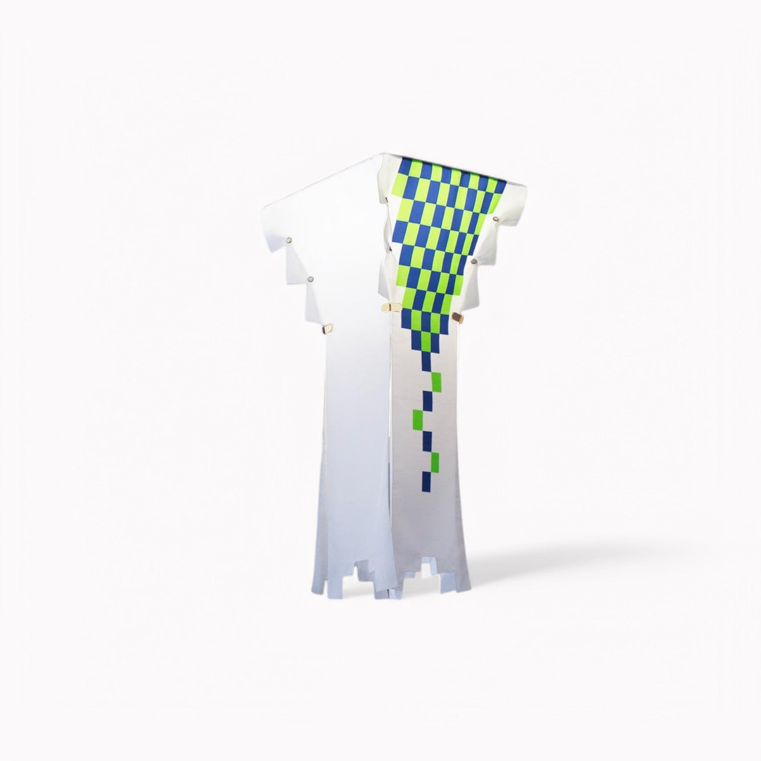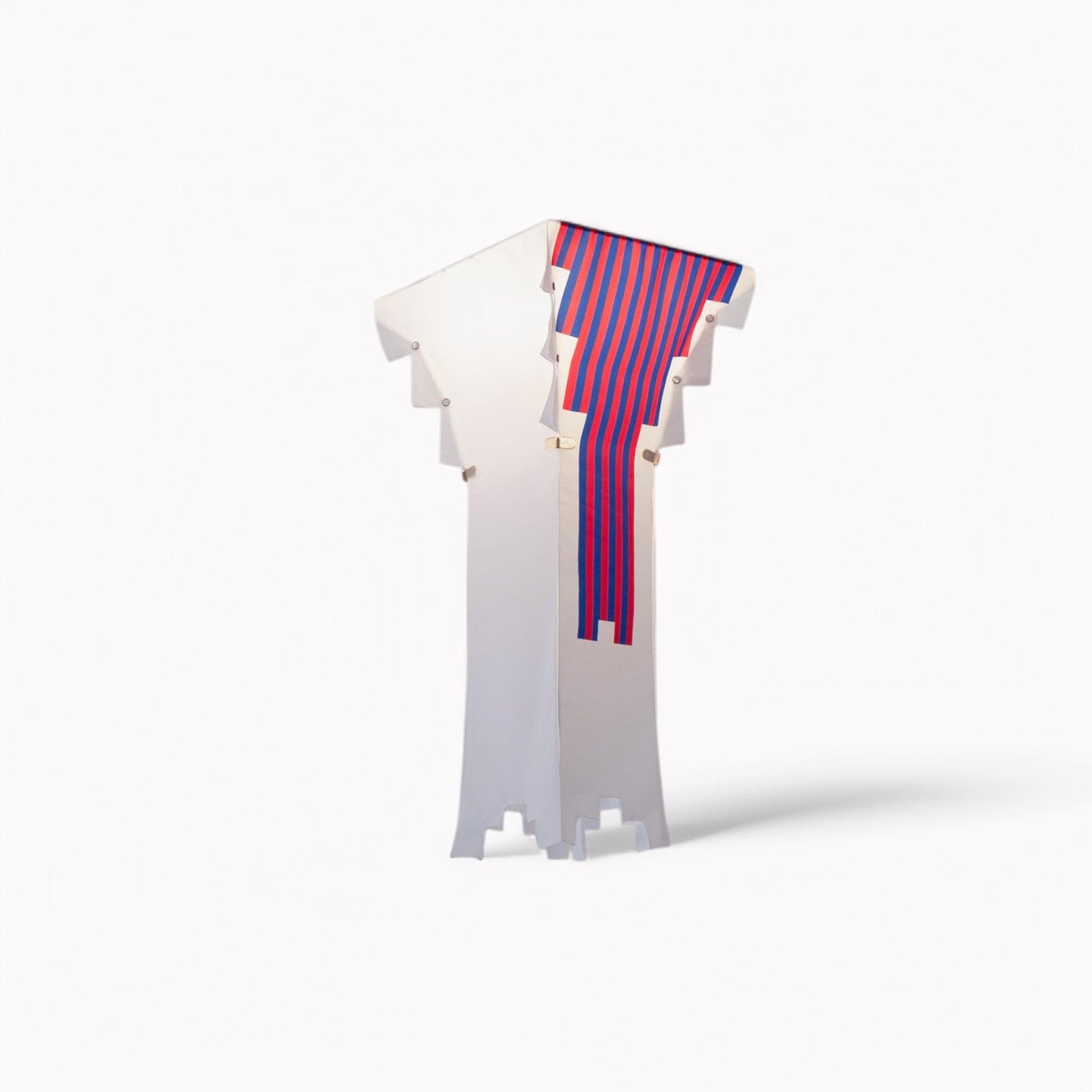 Édition spéciale du plafonnier Naeko par le créateur de mode Kiko Kostadinov. Conçu par l'architecte et designer japonais Kazuhide Takahama pour l'entrepreneur bolonais Dino Gavina en 1984 et produit par Sirrah, le plafonnier tire son nom de l'épouse de l'architecte, Naeko, tout comme l'ensemble de canapés et de fauteuils. Travaillant à partir des croquis préparatoires originaux de Takahama, Kostadinov les analyse à travers sa propre lentille et réinterprète les possibilités offertes par l'objet, enrichissant ainsi la forme classique du plafonnier Naeko. Poursuivant la tradition de son créateur, Kostadinov s'inspire de sa future épouse Deanna Fanning et des motifs géométriques utilisés dans la collection de diplôme de Deanna et de sa sœur et partenaire de design Laura. Le plafonnier Naeko peut être personnalisé en combinant des rideaux blancs et des rideaux à motifs géométriques.